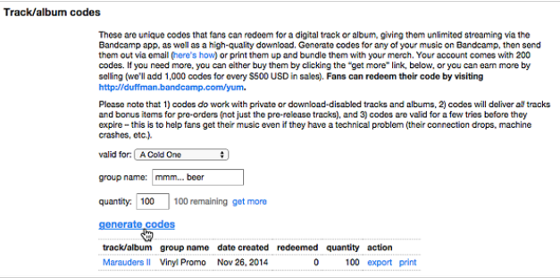 BANDCAMP CODES (FOR THE MUSICIANS)