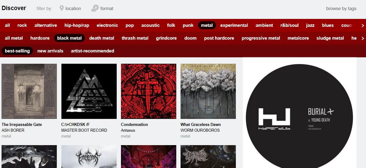 Craving some new metal? From most areas of Bandcamp, you can click the “discover” link at the top of the screen to be taken to this page. From here you can browse by genre and subgenre, and then further sort by “Best-selling,” “New Arrivals,” and “Artist-recommended.” I have found so many excellent new releases I otherwise would have missed through this feature. It’s like having a local venue next door that has shows 24 hours a day.